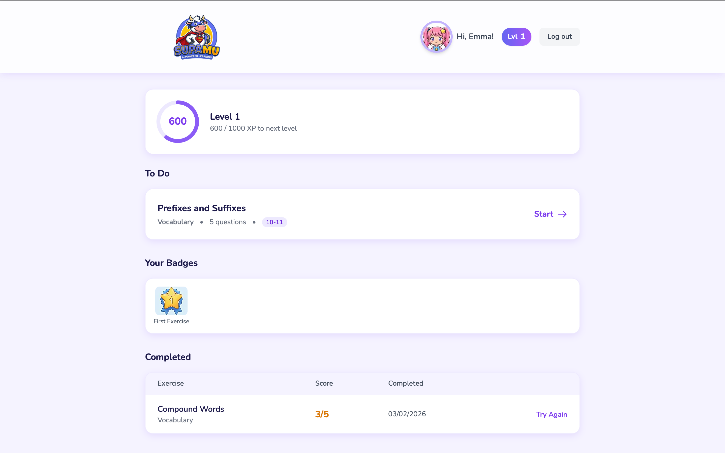 Unlike static workbooks or question banks, Supamu uses AI to generate fresh, unique exercises every time. Children log in independently with a simple code and PIN - no email needed. Parents get detailed progress tracking, and kids stay motivated with XP and badges. It's 11+ prep that's personalised, engaging, and easy to manage.